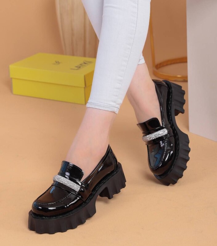 حذاء ستاتي لايكي كعب مرتفق اسود مع حبل الماس